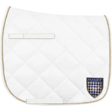 Het nieuwe Passier-quiltzadeldek met rondom Passier-belettering in een veerversie heeft een paardvriendelijk boven- en ondermateriaal van 100 procent katoen en een inzetstuk van stabiliserend schuim met extra katoenen vulling voor een perfecte pasvorm. Het zadeldekje is natuurlijk licht en zweetbestendig. Het gewatteerde zadeldek is wasbaar op 30 ° C en is ook verkrijgbaar in de “dressuur” versie.