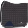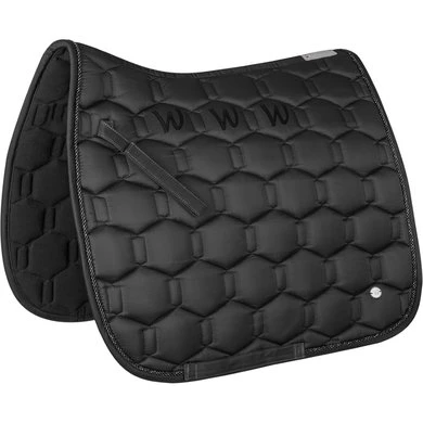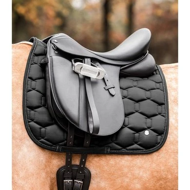 Kwaliteitszadeldek van glanzend buitenmateriaal. Opvallend is ook het zilverkleurige metalen logo en het glinsterende koord. In het zadelgedeelte bevinden zich drie siliconenapplicaties die voorkomen dat het zadel wegglijdt. Er kan gekozen worden voor een enkele of een onderverdeelde stijgbeugelriemlus.